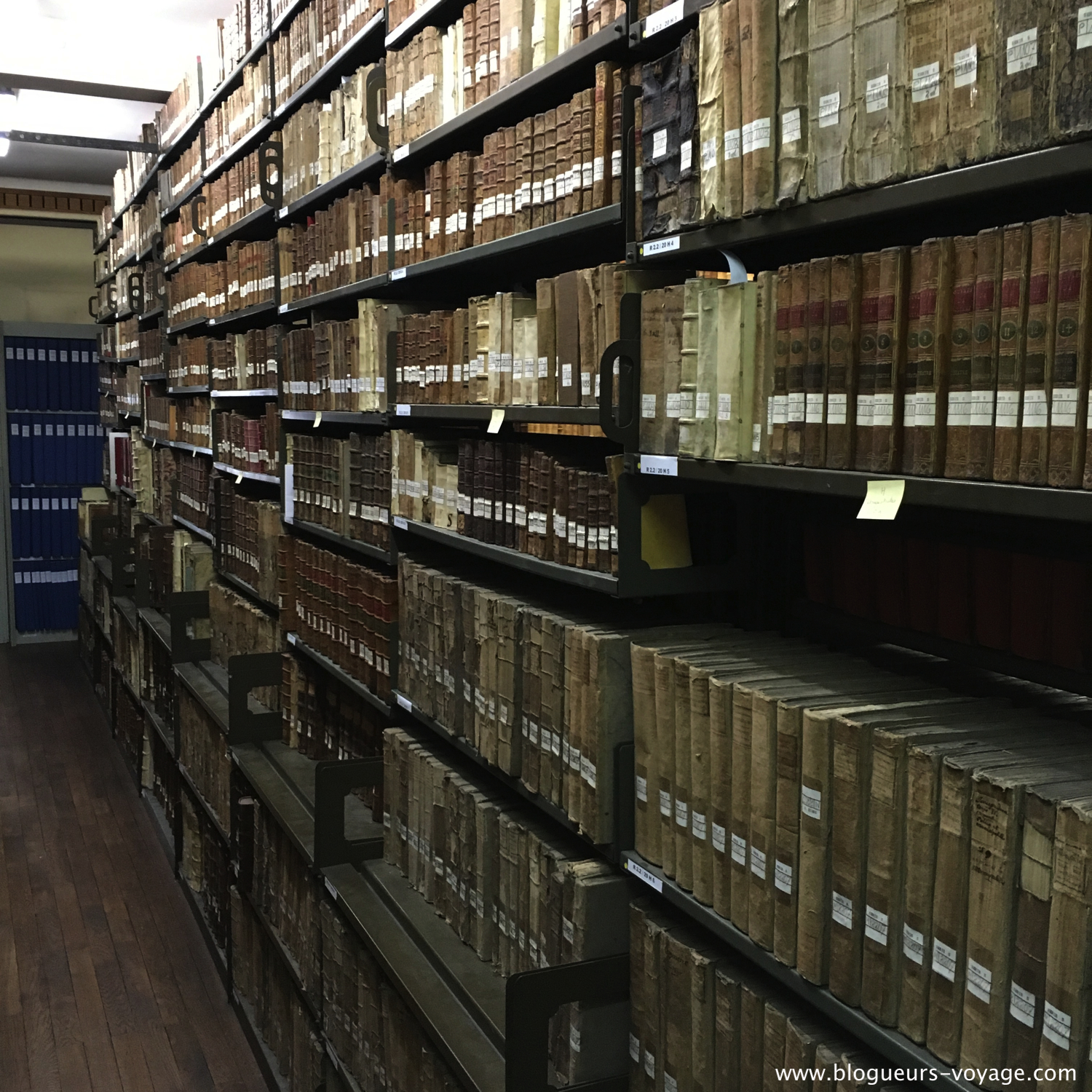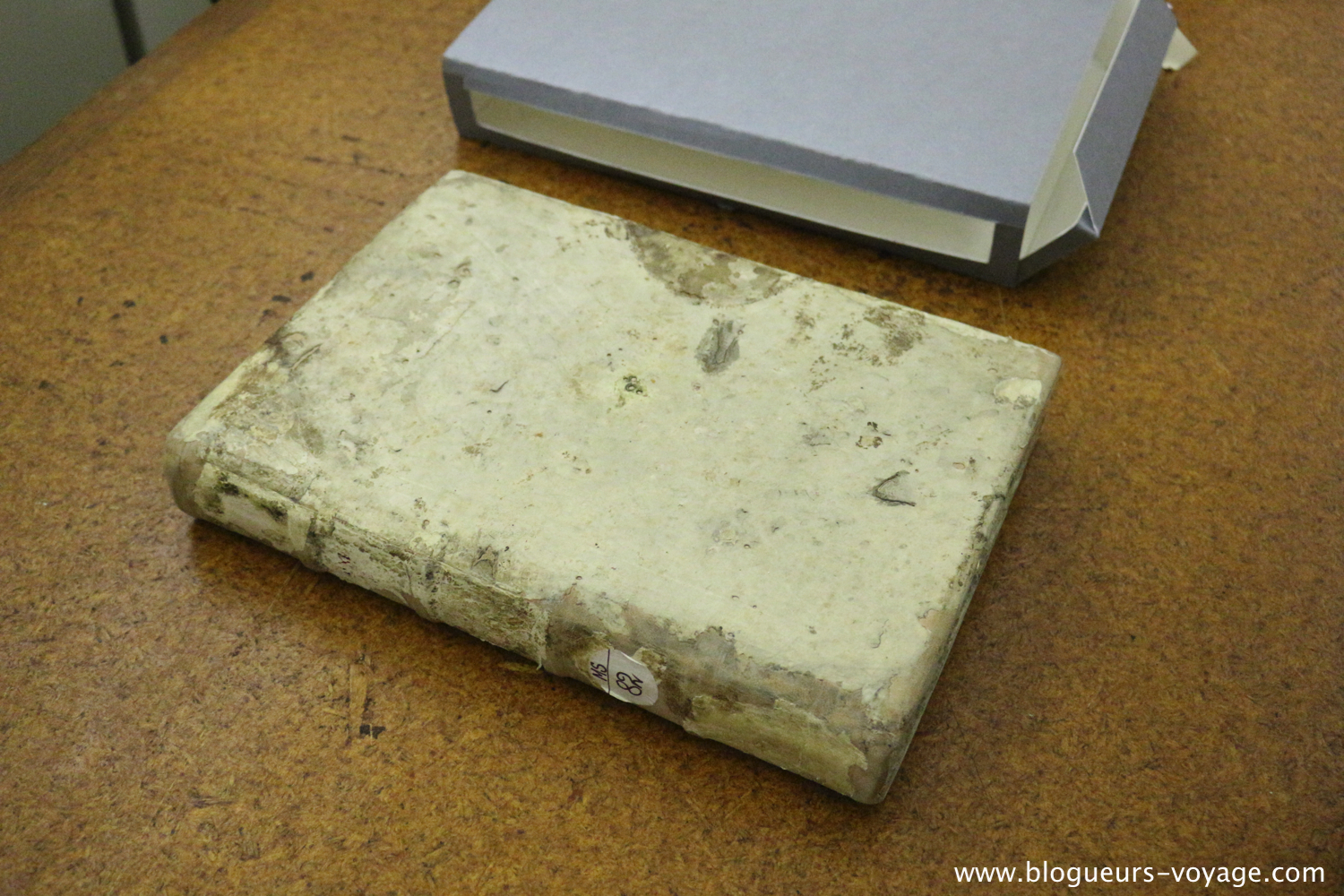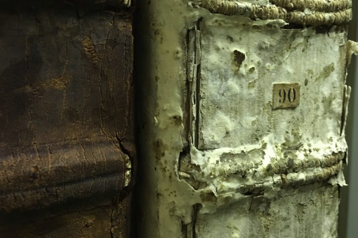 En échangeant à propos de la conservation et surtout des risques d’incendies (car « c’est la peur de tout bibliothécaire dans le monde »), le conservateur m’a expliqué que le pire n’était pas les flammes, mais l’eau… celle que les pompiers font couler à flots pour éteindre les incendies. Les livres sont comme des blocs et ils résistent relativement longtemps au feu. Par contre, l’eau va provoquer des moisissures qui détruisent irréversiblement les documents. Donc le premier geste de conservation d’un livre ayant pris l’eau, c’est de le mettre dans un congélateur. Oui, plutôt rigolo quand on y pense… mais cela permet d’avoir le temps de reprendre les livres un par un sans risquer de voir la moisissure s’installer.