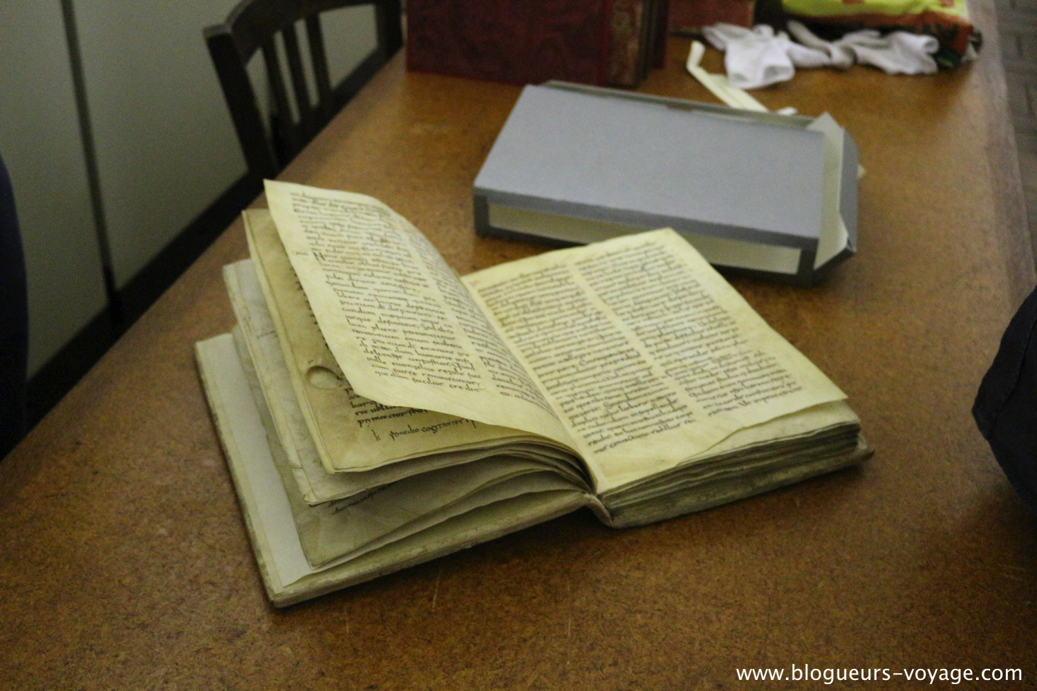 A mon arrivée au cœur de la réserve de livres anciens, mes oreilles se sont comme fermées et je me suis automatiquement dirigé vers des étagères où trônaient comme des seigneurs, de magnifiques livres patinés par les siècles. Blanchis et brillants pour certains, craquelés et restaurés pour d’autres. Hors de question de toucher de tels objets historiques, mais quelle ambiance et quelle odeur dans cette salle spectaculaire. Une richesse patrimoniale, historique et culturelle inestimable. J’avais déjà pu voir quelques livres anciens mais je n’avais jamais imaginé voir s’ouvrir devant mes yeux un manuscrit datant du VIIIe siècle.
