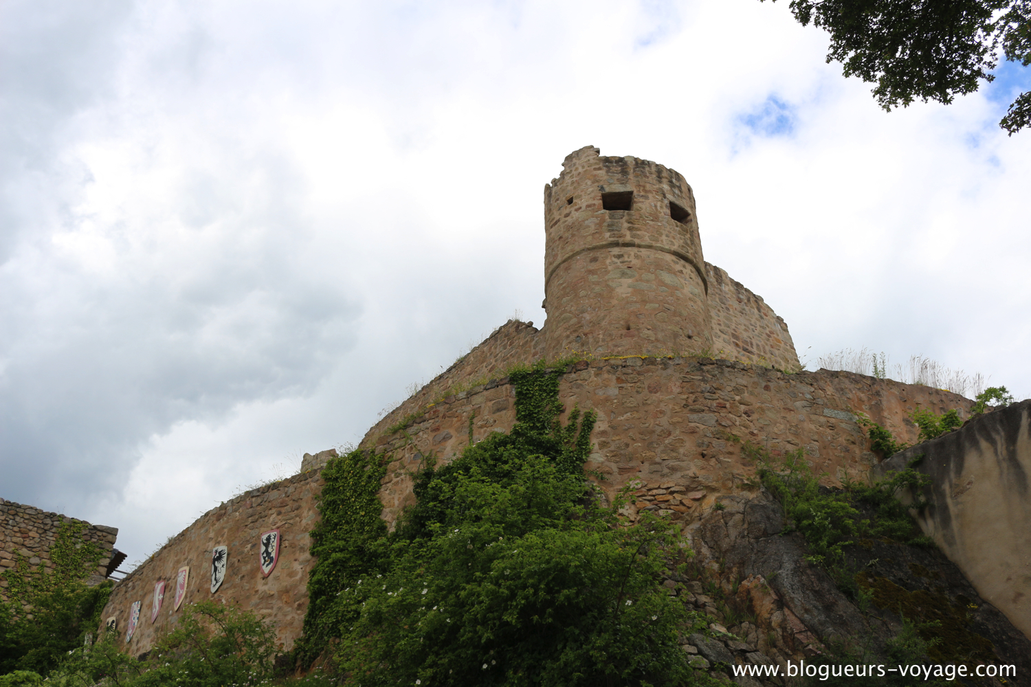 Dans l’ambiance d’un dimanche en famille, nous avons fait le tour du château avec une jeune guide très calée et dynamique qui nous a appris plein de choses intéressantes. Que le seul siège du château dura 10 minutes, que les gens du moyen âge, contrairement à ce qu’on peut penser, se lavaient tous les jours,… qu’il fallait 2 jours à pied pour rejoindre le premier village (Wintzenheim), qu’autour du château contrairement à maintenant, tout était défriché sur 300m. Non seulement pour avoir une visibilité pour défendre le site avec les archers, mais bêtement parce qu’à l’époque, pour se chauffer il fallait du bois… et autant le prendre le plus près possible. Qu’au plus fort de l’activité du château ce sont seulement 25 à 30 personnes qui vivaient sur place.