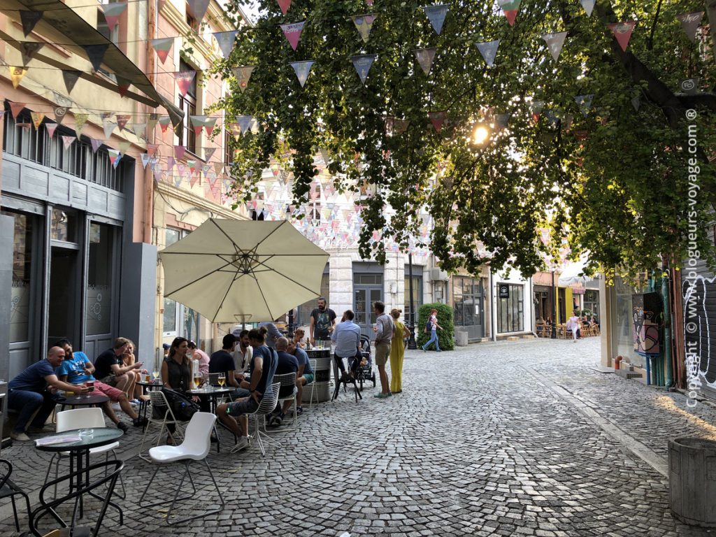 A deux pas, vous entrez dans le quartier de Kapana. L’emblème du renouveau de la ville et de sa candidature en tant que capitale Européenne de la culture 2019. En seulement 5 ans, tout ce quartier a été refait. Routes, façades, aménagements. C’est LE quartier tendance de Plovdiv, et l’un des quartiers les plus tendances de toute la Bulgarie. Les cafés, restaurants et petites boutiques y sont très nombreux et l’ambiance guinguette avec les fanions qui relient les bâtiments ajoutent encore plus de charme a cet endroit.