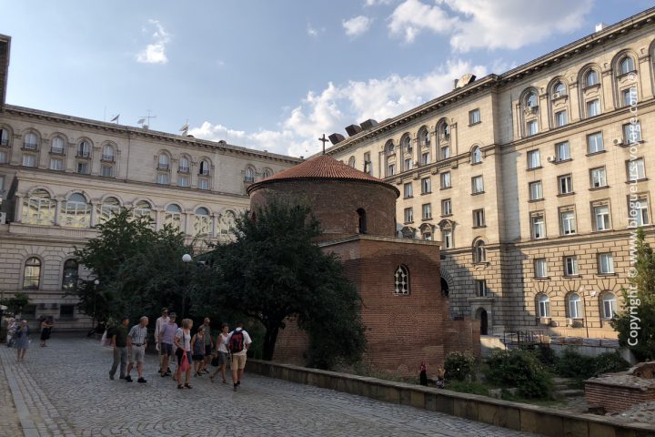 En sortant de ce dédale souterrain, vous serez juste à côté du quartier où se trouve le palais présidentiel. Là, vous pourrez voir les fameux gardes Bulgares. N’hésitez pas à vous faufiler par le porche qui se trouve juste à côté (sur la gauche) pour découvrir la rotonde Saint Georges et d’autres ruines antiques.